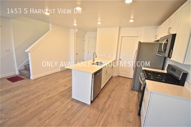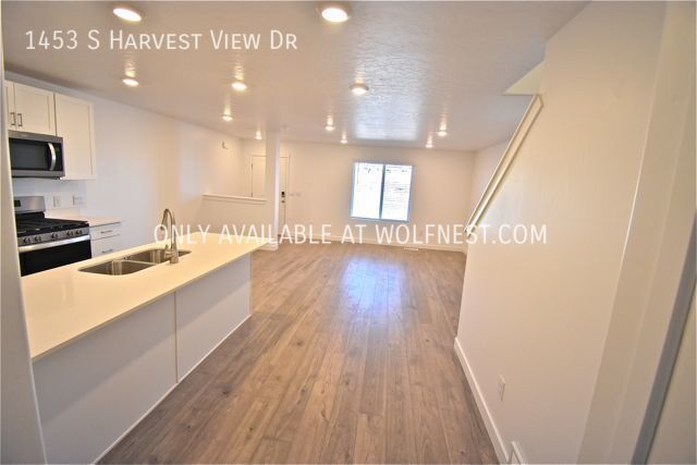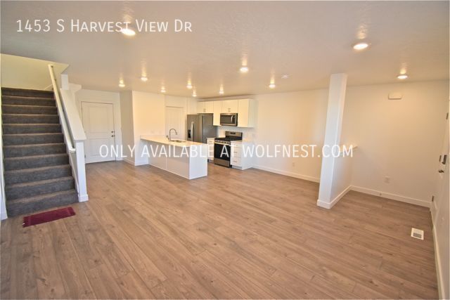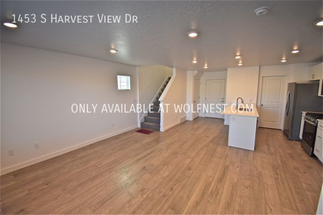 This newer townhome features an open floor plan and is conveniently located minutes from I-15, Harvest View Sports Complex, The Hills at Summit Ridge Dog Park & many shops/restaurants! It offers 3 bedrooms and 2 bathrooms spread over 1,400 sq. ft. As you walk in, you'll find an open kitchen, dining and living area with access to the garage. If you head upstairs, you'll find two bedrooms, a full bathroom, a laundry room as well as the master bedroom and bathroom. Additional amenities include brand new stainless steel appliances, washer/dryer in unit, smart home features, 2 car garage & high speed fiber internet included!