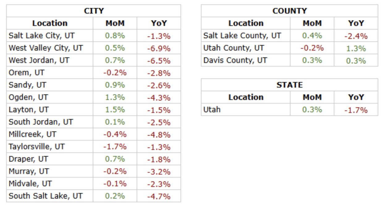 Utah’s rental market showed modest stabilization this month, with statewide rents increasing 0.3% month over month while remaining 1.7% below last year’s levels. At the county level, Salt Lake County posted a small monthly gain but remains down year over year, Utah County continues to lead with positive annual growth, and Davis County recorded slight increases both monthly and annually. City trends were mixed but generally steady. Several cities including Layton, Ogden, Sandy, and Salt Lake City saw small monthly increases, while a few areas such as Taylorsville and Millcreek experienced minor declines. Overall, the data suggests a stable rental environment with modest monthly movement as the market continues to rebalance.
